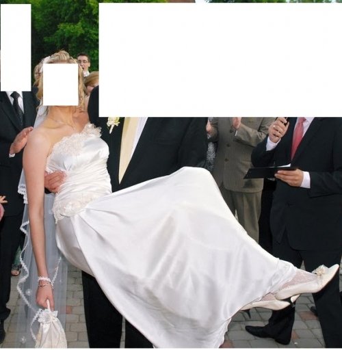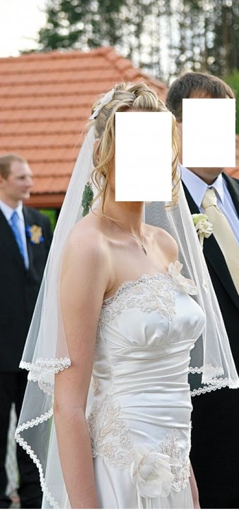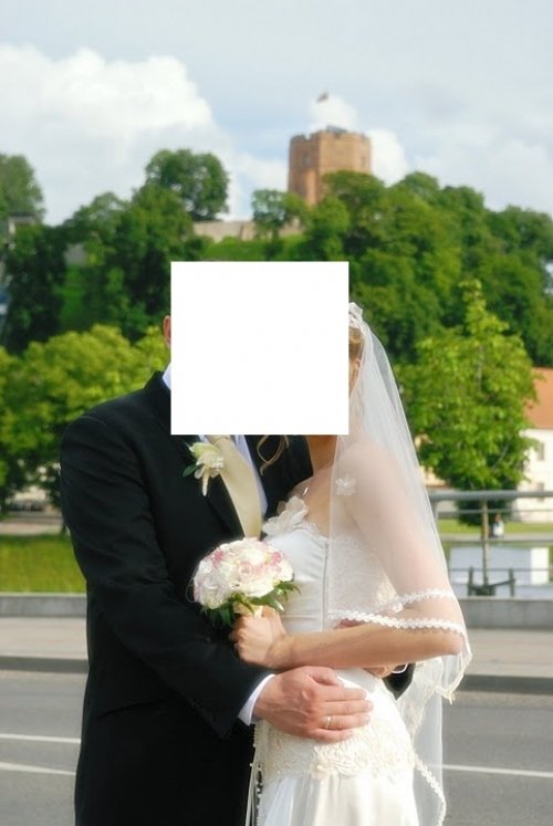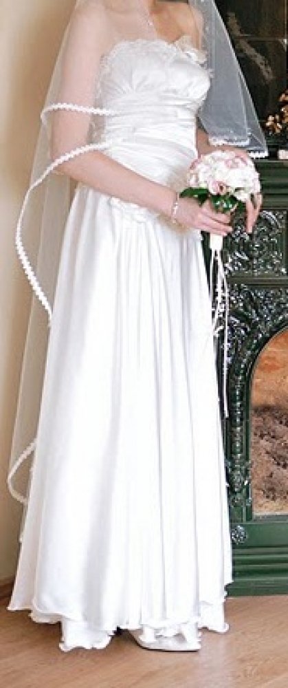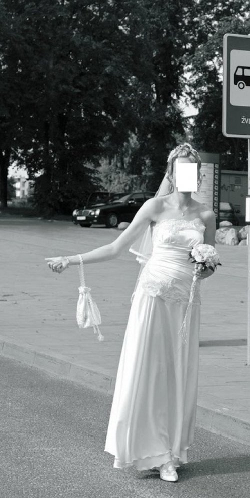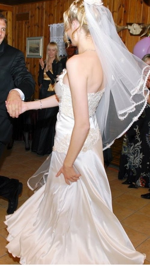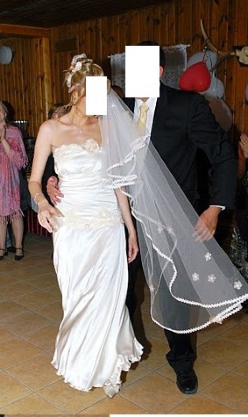 Parduodu viena karta deveta, ranku darbo, naturalaus silko, sampano spalvos, su svarovskiu kristalais ir ranku darbo gelytem issiuvineta vestuvine suknele.