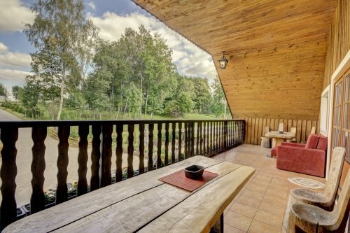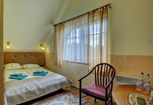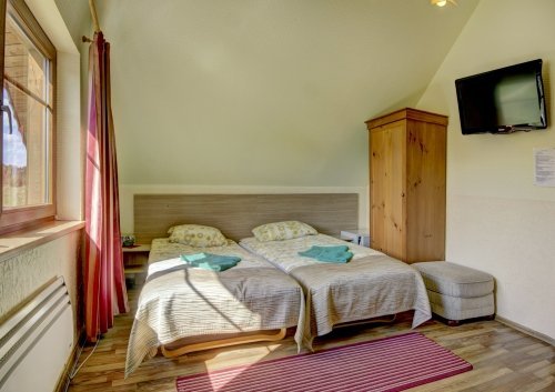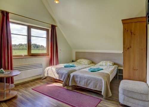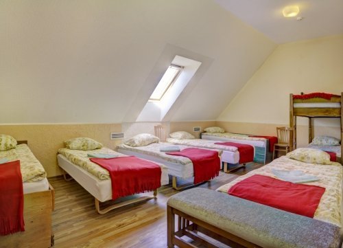 Nakvynei galėsite apsistoti viešbučio kambariuose arba rąstiniuose nameliuose. Patogiai apnakvindinti galime iki 90 svečių, o esant reikalui miegamų vietų skaičius gali būti padidintas.