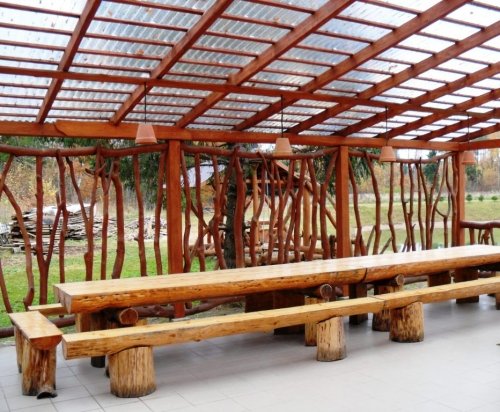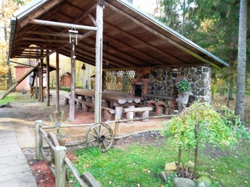 Dvi pobuvių pavėsinės ir šokių salė lauke.