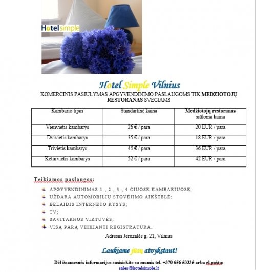 Užsakovų patogumui – kitapus gatvės įsikūręs viešbutis Hotel Simple, kuriame pagal mūsų tarpusavio susitarimą labai palankiomis kainomis galima užsakyti nakvynę iš toliau atvykusiems svečiams. Pas mus jiems galima užsakyti pusryčius, o gal ir šventės pratesimą.