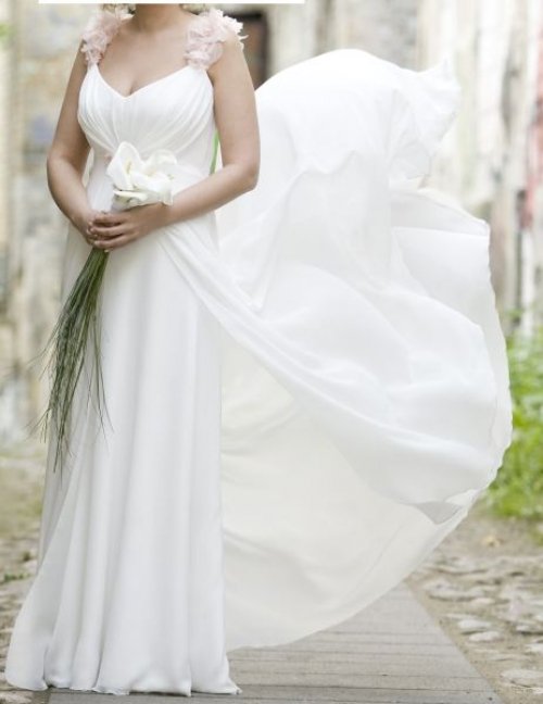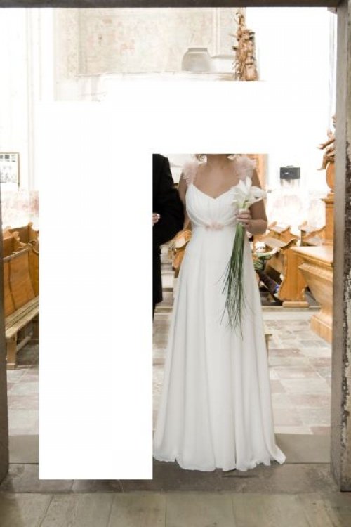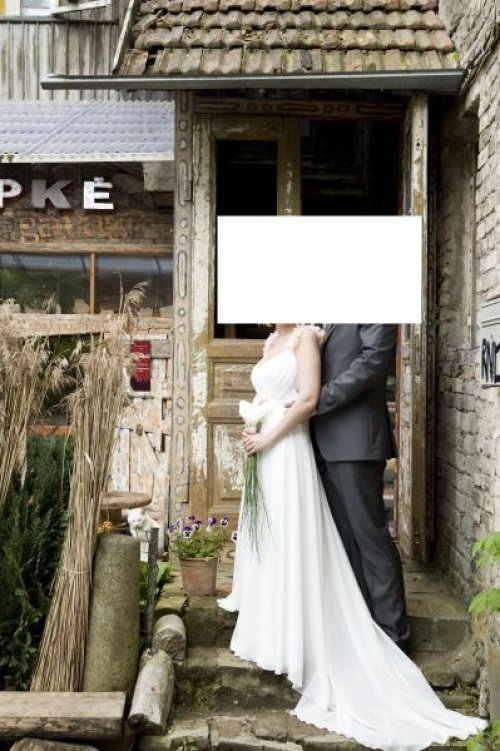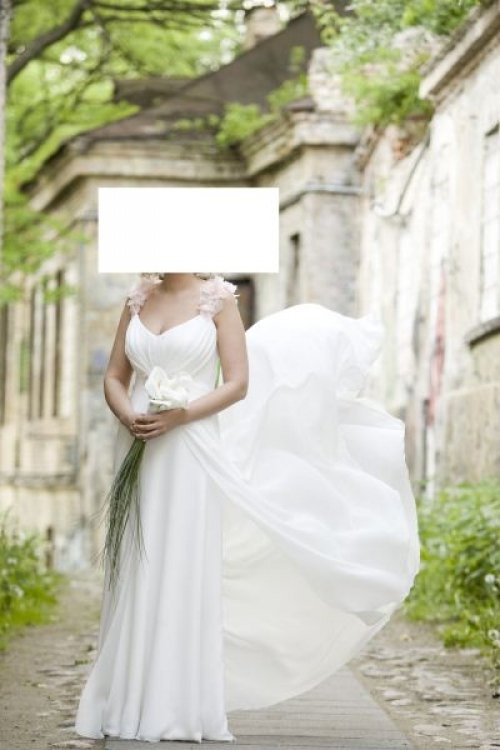 Parduodama balta Wamp mados namuose siūta vestuvinė suknelė. Suknelė dėvėta vieną kartą. Suknelė yra su šleifu. Gėlytes ant suknelės galima nuimti ir pakeisti kitomis. Suknelė išvalyta ir laukia nuotakos. Dydis 38.
