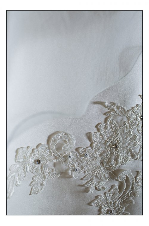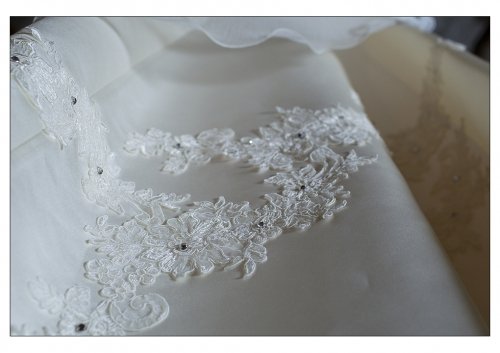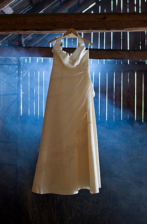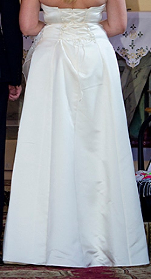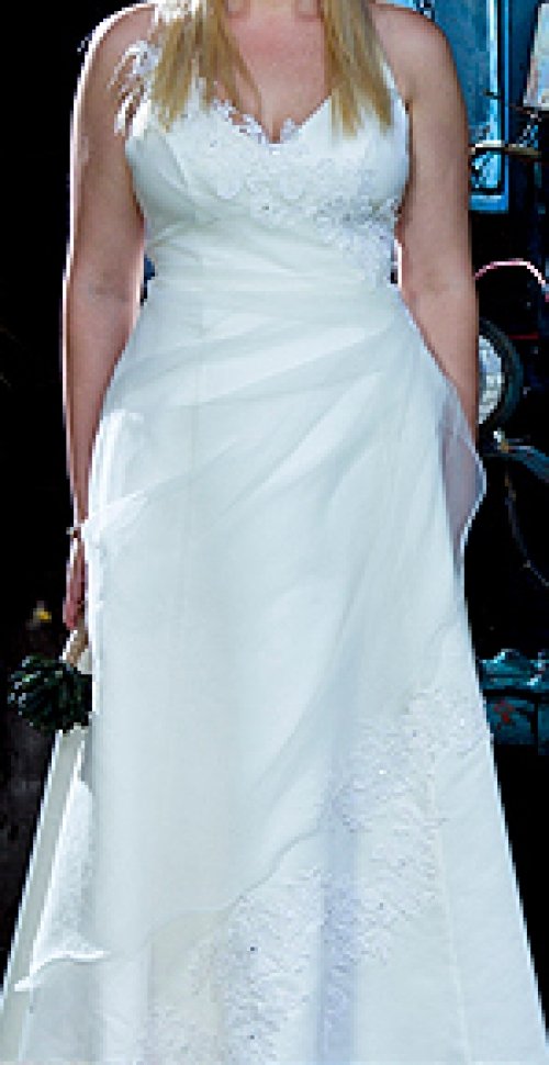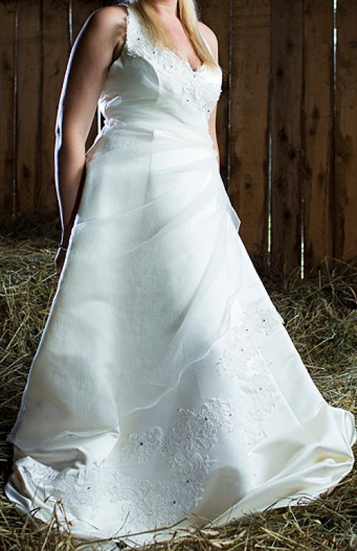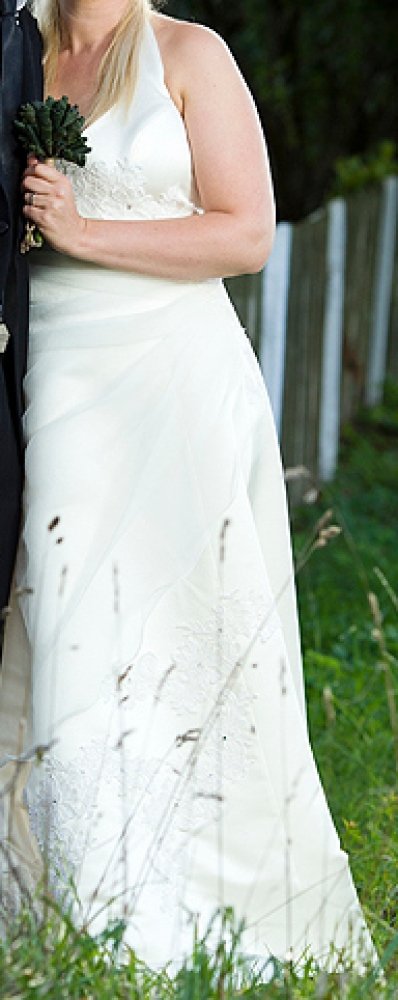 Parduodu vieną kartą dėvėtą vestuvinę suknelę. Audinio sudėtis - atlasas ir organza. Suknelė turi pasijonį, kuris yra prisiūtas prie suknelės, todėl patogu dėvėti. Suknelė dabinta blizgiais akmenėliais ir paklijuota nėriniais. Užsegama per kaklą, nugaroje suvarstoma kaip korsetas, pečiai atviri. Labai gerai susiveržia, todėl papildomo korseto tikrai nereikia, taip pat nebūtinas ir liemenukas.