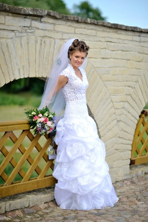Parduodu prabangią, vieną kartą dėvėtą pagal individualų užsakymą siūtą, išskirtinio dizaino , vestuvinę suknelę. Idealiame stovyje, išvalyta. Lengva, be jokių metalų. Prabangus gipiūras dailiai priglunda, pabrėžia liemenį. Pridedamas nuometas.