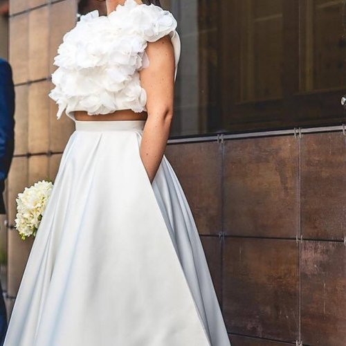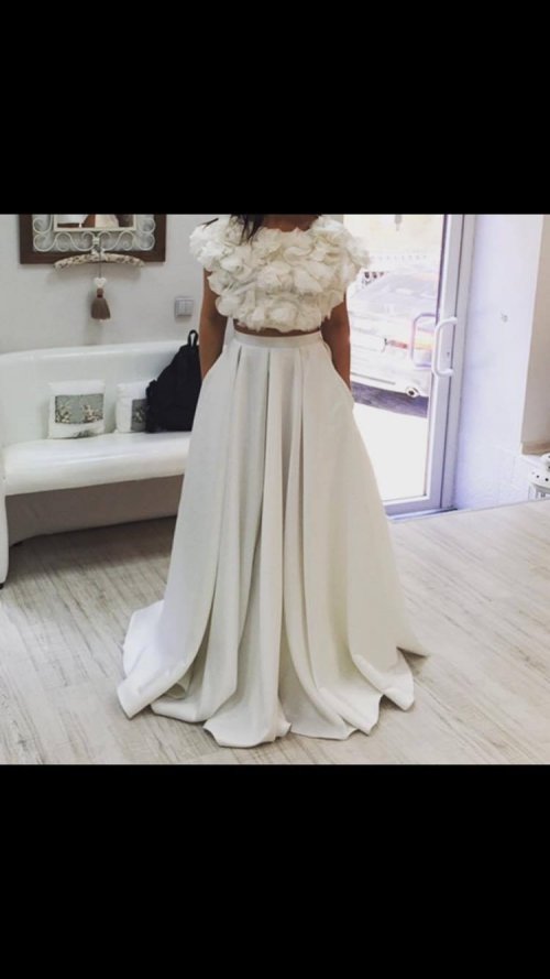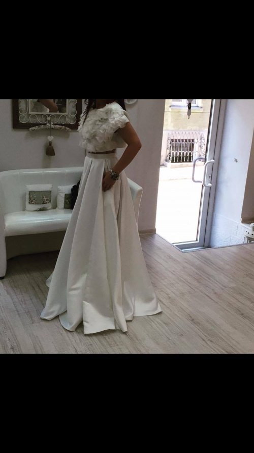 Parduodu Inži mados namų 2015 metų kolekcijos vestuvinę suknelę. Suknelė natūralaus šilko iš dviejų dalių: kimono su prisiūtomis gėlytėmis iš šilko ir sijonas su kišenėmis. Taip pat prie sijono yra pasijonis. Suknelė išvalyta, išvaizda kaip naujos. Suknelę vilkėjo 160cm ūgio mergina su 12cm aukščio bateliais.