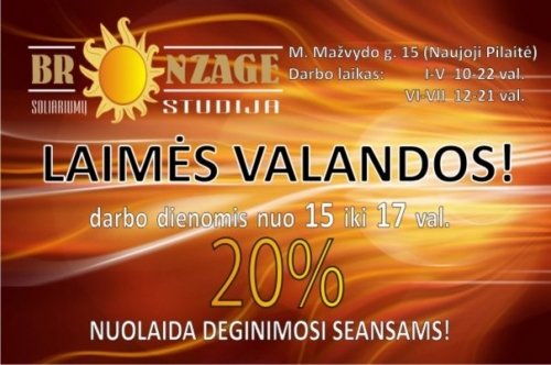 Neduoda ramybės mintis,kaip išsaugoti vasaros įdegį, energiją, gerą nuotaiką? Užsukite į soliariumų studiją "BRONZAGE" ir mėgaukitės gražiu įdegiu, puikia nuotaika, ištisus metus. Pas mus visada šviečia saulė. Laukiame Jūsų:)