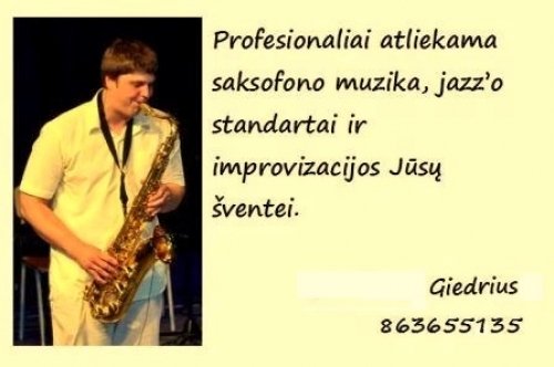 Profesionaliai atliekama saksofono muzika, jazz‘o standartai ir improvizacijos Jusu sventiniam vakarui, pobuviui, fursetui ar kitai sventei. Jusu pageidavimui galiu paruosti specialius kurinius. Groju vestuvese: kai nori fonines muzikos, sventes pradzioje, kol renkasi sveciai, vakarieniaujama, ceremonijos metu ir po jos. Turiu savo profesionalia aparatura. Groju su fonogramomis, su grupe, taip pat ir solo. Galiu pagroti dovana – sveikinimo kurinys. Pats paimu uzsakytas geles ir nuvykstu i vieta. Galiu atvykti i bet kuri Lietuvos miesteli. Giedrius 863655135