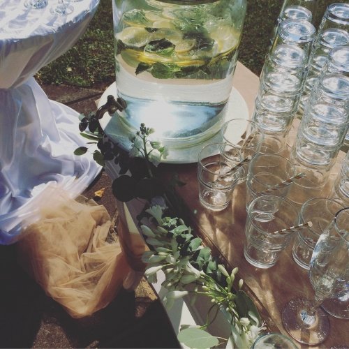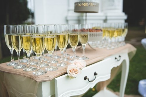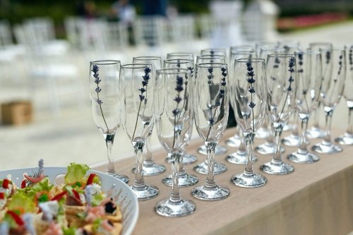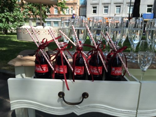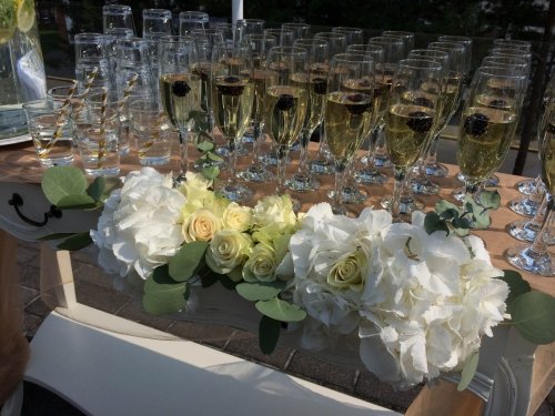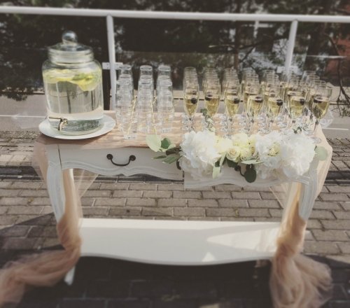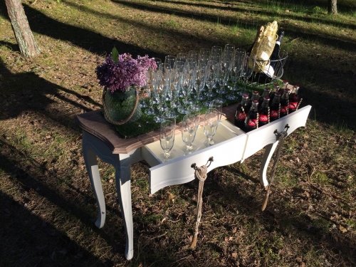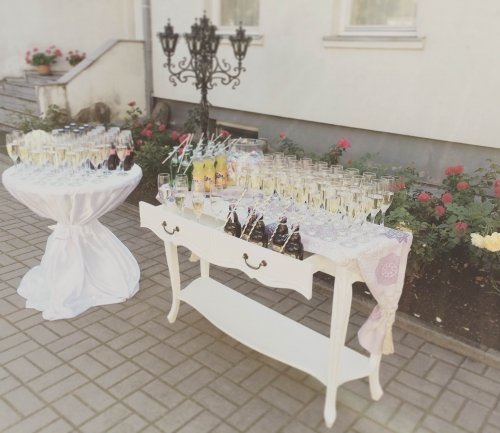 Pirmasis - dekoruotas staliukas su reikiamu šampano taurių skaičiumi, kelių litrų gaiviojo gėrimo indas su kraneliu, bei gaiviojo gėrimo stiklinės.